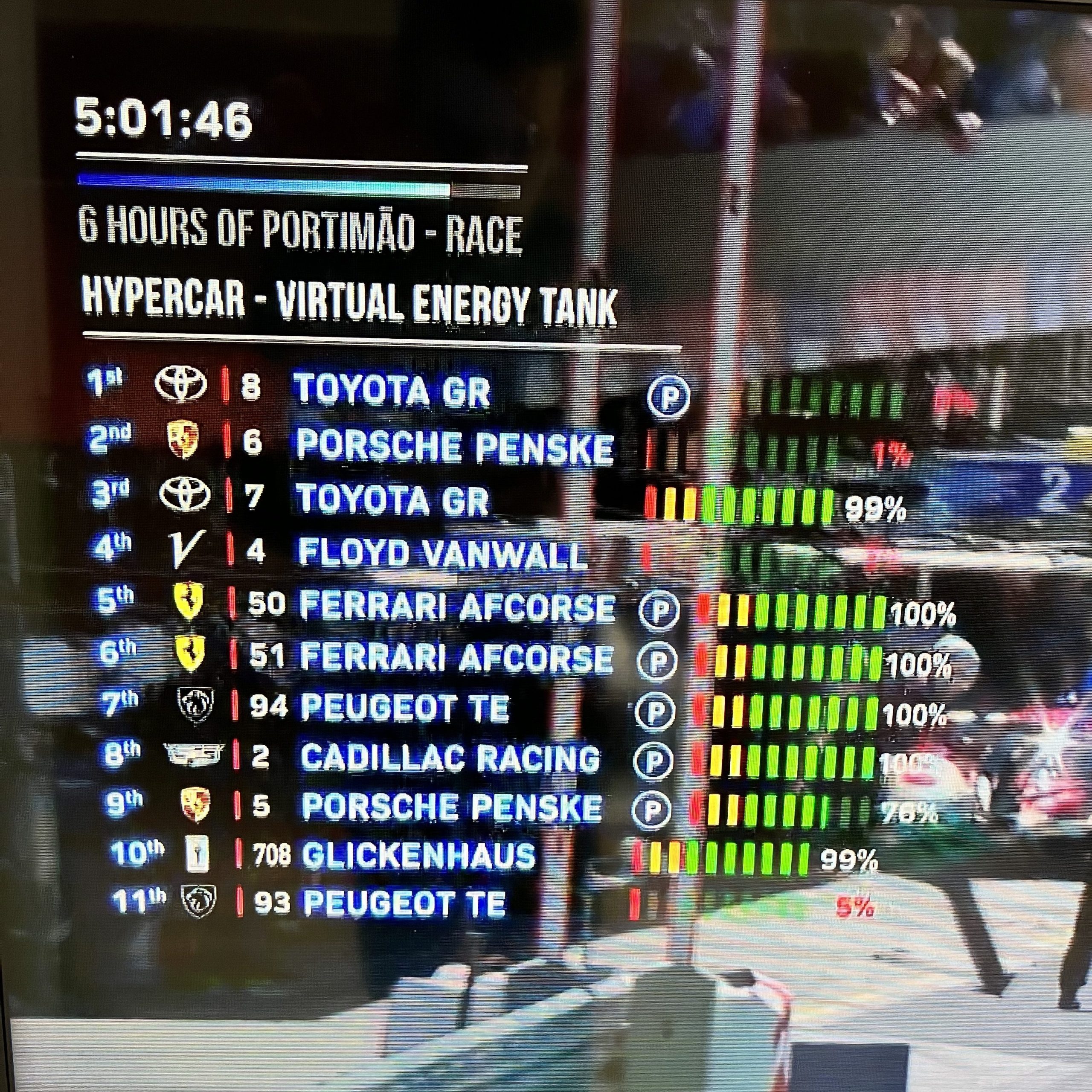 🇩🇪 Update nach drei und halb Stunden vom Rennen: Update with two-and-a-half-hours of the race remaining: P1: #8 Toyota (Hirakawa) / P2: #50 Ferrari (Molina) +59s / P3: #6 Porsche (Estre) +1:18 / P4 #51 Ferrari (Giovinazzi) +1:23 / P5 #94 Peugeot (Menezes) +1 lap